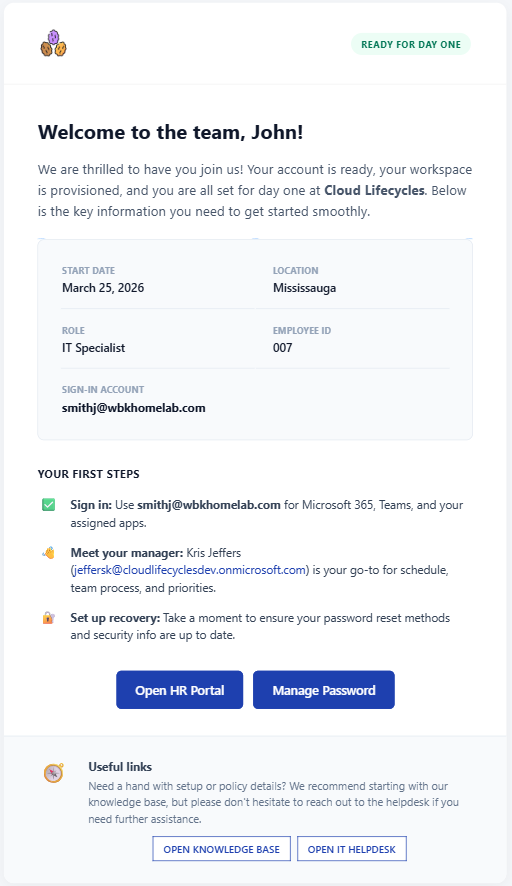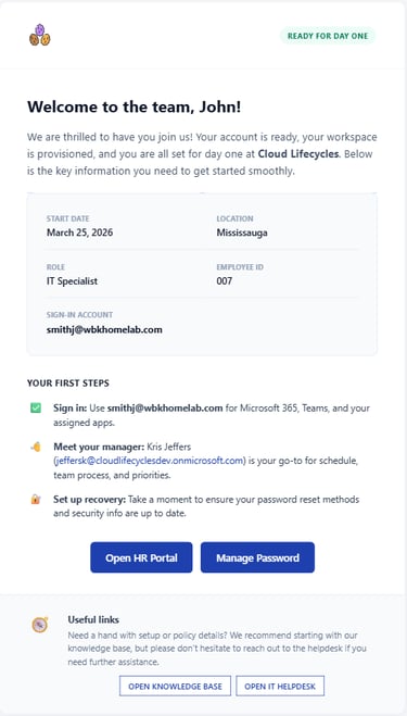 WC365 covers the gap before day one. By collecting a personal email during hiring, it can contact new employees before their corporate account exists. Welcome kits, first login instructions, and key onboarding details are delivered directly.